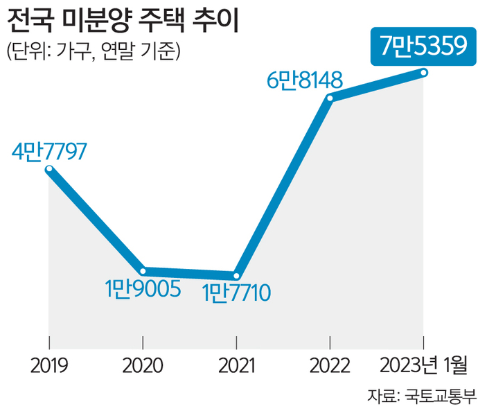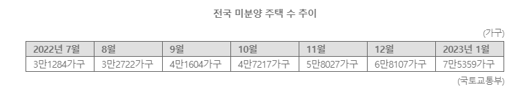 위에 표를 확인해 보면 2022년 7월에 3만 가구 9월에는 4만 가구 그리고 11월에는 5만 가구 12월에는 6만 가구 그리고 2023년 1월에 7만 5천 가구가 넘었습니다. 이렇게 보듯이 미분양이 상승하는 폭이 상당히 빠릅니다.