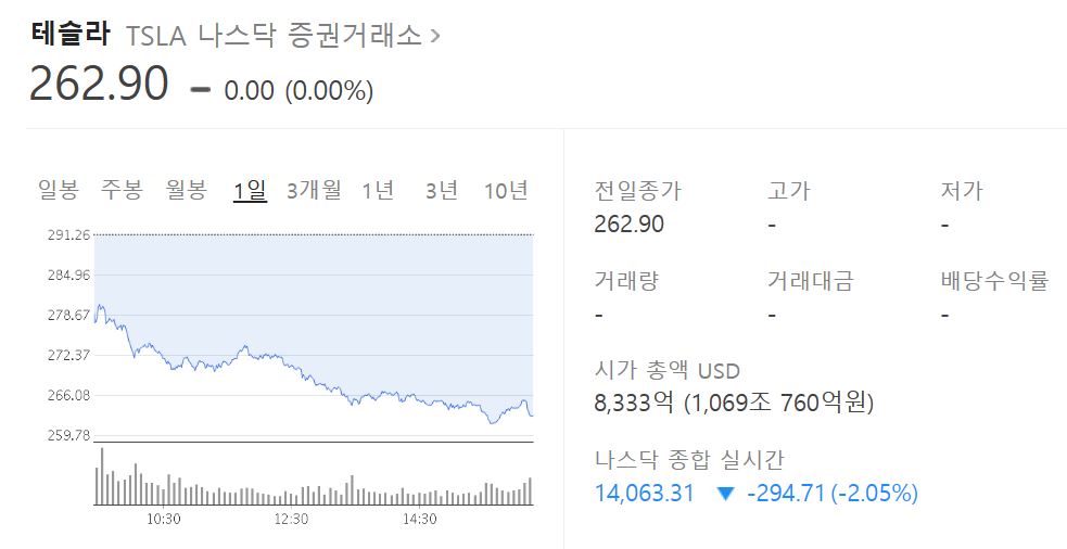 이 수치는 테슬라 주가 일일 하락폭으로 확인하자면 4월 20일 이후 최대치입니다.