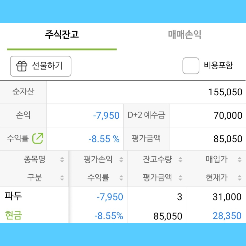 잠깐의 시간 동안 손실을 보았지만, 투자가 항상 수익만 있을 순 없으니 손실에 대한 충분한 준비와 깨달음을 얻어 앞으로 좋은 결과를 기대해 보겠습니다.