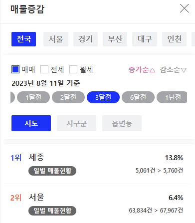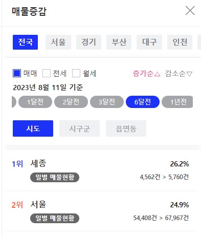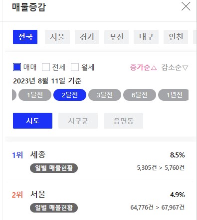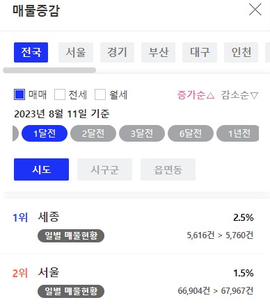 6개월 전에 서울이 증가순 2등으로 24% 증가하던 것이 점점 증가세가 줄어들더니 1달 전에는 1.5%까지 증가세가 줄어들었습니다.