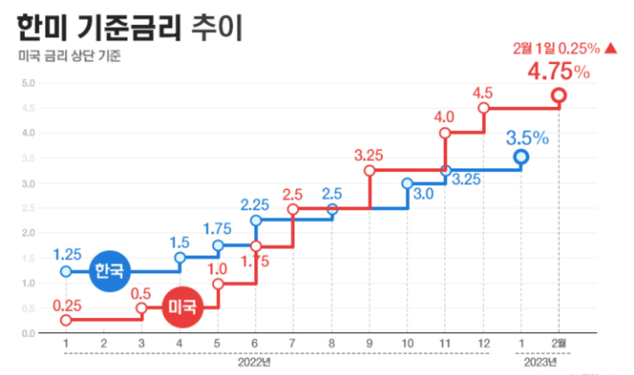 미국 연방준비은행은 최근에 발표된 물가지수를 토대로 인플레이션이 쉽게 잡히지 않고 있다는 판단을 하고 있습니다. 결국 추가 금리 인상 가능성이 높습니다. 미국이 3월에 있는 회의에서 한차례 베이비스텝(0.25%) 인상을 단행한다면 한미 기준금리 격차는 1.50%로 벌어지게 됩니다. 특히 최근에는 3월에 미국 연방준비은행에서 빅스텝(0.50%)을 단행할 것이라는 예측이 더욱 힘을 얻고 있는 중입니다. 미국 물가가 잡히지 않는 것이 큰 문제라고 판단하기 때문입니다.