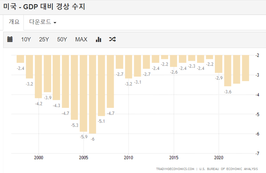 이 시기에는 원달러환율이 어땠을까요? 이 당시에는 앞에 2개의 기준금리 역전의 경우와는 차이가 있습니다. 미국이 인위적으로 달러약세를 선택하게 됩니다. 그 이유는 그 당시가 서브프리임모기지 관련 금융위기 전이었습니다. 당시 미국 경상수지 적자는 90년대를 지나면서 꾸준히 증가해 2005년에는 8,090억 달러에 달했습니다. 이것은 미국 전체 GDP의 약 6.4%에 달하는 엄청난 규모였습니다. 이러한 경상수지 적자를 회복하는 방법은 달러를 낮춰서 미국 제품의 경쟁력을 살리는 것이었습니다. 이와 같은 이유로 미국에서는 인위적으로 달러 약세를 선택하였습니다.