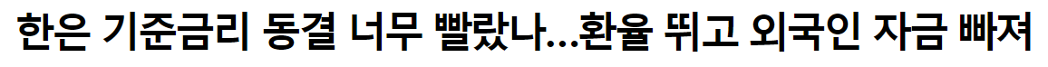 2023년 3월 1일 뉴스 최신기사의 제목입니다. 한국은행의 금리 인상을 멈춘 후 원달러환율이 멈추고 주식시장에서는 외국인들이 자금을 한국에서 빼고 있다는 소식입니다. 물론 단기적인 현상일 수 있습니다. 하지만 미국과의 금리 차이를 고려했을 때 너무 일찍 금리인상을 멈춘 것이 아닌가 하는 걱정이 늘어나고 있습니다.