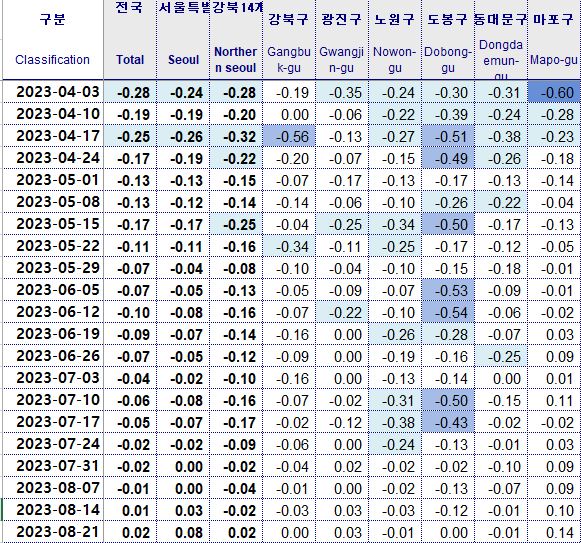 KB 시세표에서 8월 21일 자 발표된 기준으로 보면 전국의 집값이 0.02% 상승으로 돌아선 것을 확인할 수 있습니다. 특히 서울은 더 큰 폭인 0.08%로 상승하였고, 이런 현상은 매매가격뿐만 아니라 전세가격에도 나타나고 있습니다.